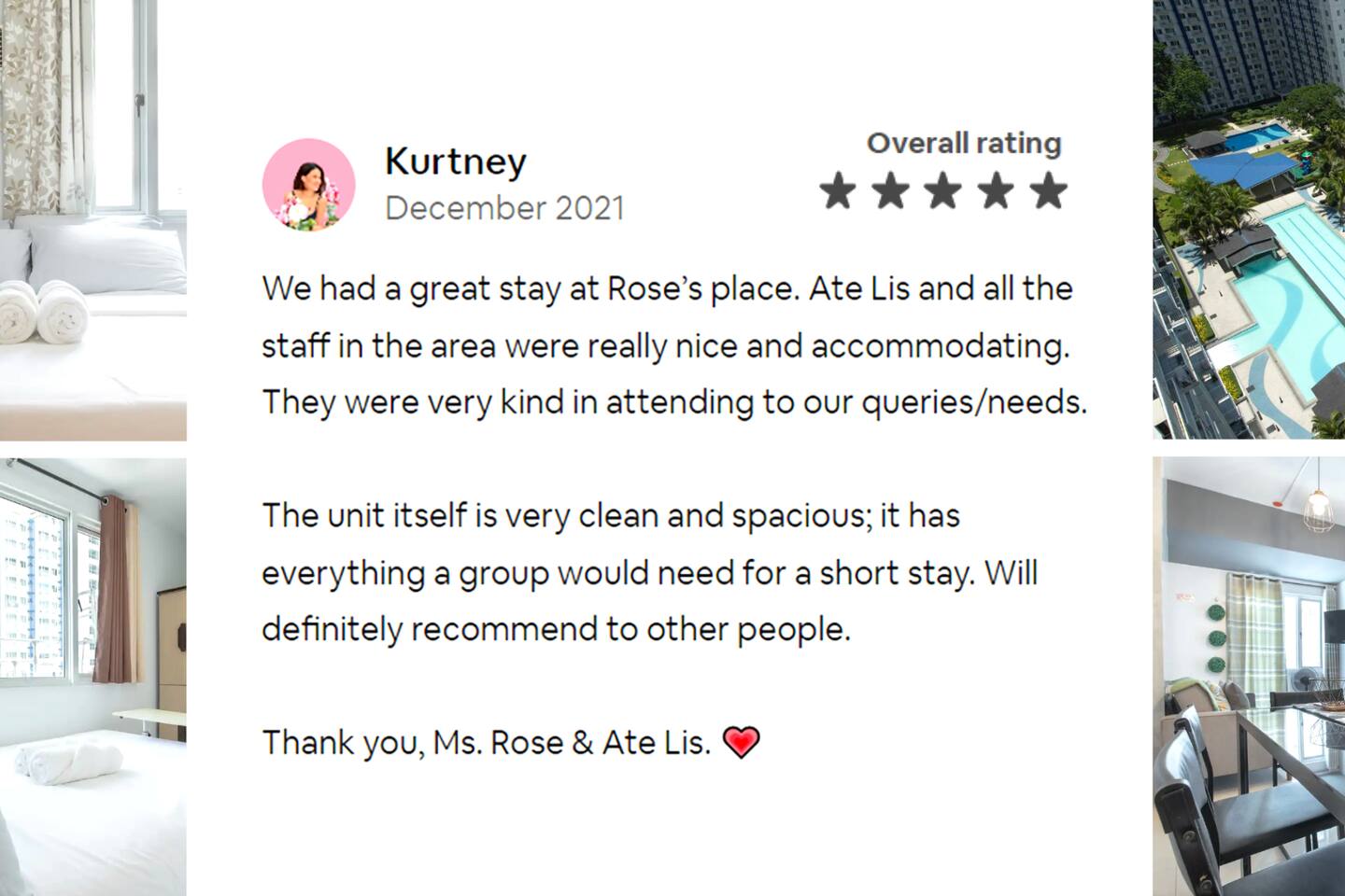 ✦ GUEST REQUIREMENTS BEFORE ARRIVAL ✦ 🪪 Valid government-issued IDs of each staying guest need to be sent as soon as possible or atleast a few days before check in. Only valid government IDs are accepted by the condo admin office, such as passports, driver's license, PRC, Tin ID, SSS, UMID, PhilHealth, NBI/police clearance, and the like. * For young adults without government IDs, you may provide a University or School ID. * For foreign nationals, the ID required is a passport. * For children without government-issued IDs or school IDs, you may provide their birth certificate. You may block off any sensitive information before sending IDs :) These are required by the condo admin for us to process the Guest Authorization needed for your stay. Once IDs are complete, assistance and check-in instructions shall be provided. 👥‼️ NO VISITOR POLICY We also implement a No Visitor policy. Hence, we expect only the total number of guests declared on the reservation. With this, only registered guests are allowed to have access to the unit during the entire stay. • • • • • • • • • • • • • • • • • • • • ✦ ABOUT OUR COZY PLACE ✦ 🏢 Our unit is located on the 18th floor of Tower 1-A in The Grass Residences, just beside SM North EDSA Mall (with connecting bridge-way!) With ours being a corner unit, we have a spacious balcony with a beautiful view of the city — perfect for those who love watching sunsets/sunrises! We've set up a 6 seater outdoor table set up that serves as additional hang-out space! 📏 Our condominium unit also has a floor area of 54.1 square meters. • • • • • • • • • • • • • • • • • • • • ✦ WHAT'S INSIDE? ✦ 🛏️ Sleeping Set Up / Beds & Bedrooms • Bedroom 1 – Full-double bed with Private Bathroom • Bedroom 2 — Queen-sized Bed • Extra Sofa-Bed — At night, the living room sofa bed can serve as a double bed for the 5th and 6th guests — Beddings for the sofa are only provided if reservation is booked for 5-6 guests We also provide the following complimentary items for our guests' maximum comfort and convenience: — Bath towels for each guest — Shampoo — Conditioner — Shower gel — Liquid hand soap — Toilet paper — Toothpaste — Dishwashing liquid and sponge 🛋️ Living and Dining Room • 3-seater sofa bed; convertible to smaller double bed; serves as additional sleeping set up at night (for reservations booked for 5-6 guests) • Wall-mounted 39" smart TV w/ Netflix access • FREE WiFi with a speed of 50 mbps+ and up (provider is Woofy PH). • 6-seater dining table with chairs and benches 🍽️ Kitchen Entire kitchen space has been remodeled for a new modern look! The kitchen includes the essentials for light meal preparation. To maintain the condition of the unit and prevent strong odors that may linger, heavy cooking is restricted. Light cooking, reheating, and simple dishes are perfectly fine. • All basic utensils: plates, bowls, saucers, spoons, forks, knives, glasses, and coffee mugs (set up will be based on the no. of guests in the unit) You’ll have free access to the following : ✔ Full-size refrigerator ✔ Microwave ✔ Electric kettle ✔ Rice cooker ✔ Toaster All appliances must stay inside the unit at all times during your entire stay. 🍳 Additional Cooking Options / Exclusive for Longer Stays only For stays of atleast 5 nights, we can provide an induction cooker and cookware for a small fee to cover the additional electricity consumption : — For 5 nights : ₱100 per day — For 1-2 weeks : ₱500 per week — For 3 weeks or more: ₱1,000 per month If cooking is allowed during your stay, we kindly ask guests to clean up after each use and avoid leaving dirty dishes overnight, as this can attract pests, flies, or ants. 🛵🍴 Easy Food Delivery Food delivery apps (such as GrabFood or Foodpanda) give you access to hundreds of restaurants in the area. Orders can be delivered straight to the building (meet up with courier at the ground floor lobby), making dining effortless and flexible, and without the need to leave the property. :) 🧑🍳 Convenient Nearby Establishments Just across the building is a strip of cafés, convenience stores, and food outlets, giving you plenty of choices if you prefer something quick and nearby! 🛍️ Nearby SM North EDSA Mall One of the biggest perks of staying with us is the location! With SM North EDSA Mall, one of the largest malls in the Philippines, is right next door! An exclusive bridge-way connects our condominium directly to the mall, giving registered guests easy access to shopping, restaurants, cinemas, and everyday essentials just steps away :) • • • • • • • • • • • • • • • • • • • • 🛵 OTHER SERVICES OFFERED **Recommended to arrange at least 3 days in advance ✈️ Private Airport Transfers to condo (and vice versa): • ₱3,000 per way for SUVs — good for up to 4 people + 4 medium-size luggage • ₱3,500 per way for Vans — good for up to 7-8 passengers or those traveling with large luggages — tolls fees are seperate (Skyway route for faster travel) 🛒 Grocery Service • ₱1,000 covers up to 50 basic food items (generic brands) • There's additional fee for transport of big items or extra ordinary size including for example, 5-liter bottled water, a case of beer, among others. • This service is offered to guests without particular preferences to brands or products. We only buy generic ones, or the ones available in the nearby market. Grocery service fee is paid on top of the price of the grocery items. 🎁 Gift Baskets for couples / families — can be arranged, which would include items like pairs of room slippers, bathrobes, and choice between a box of chocolate (Ferrero) or a bottle of wine (Beringer White Zinfandel). Message us for more details :)